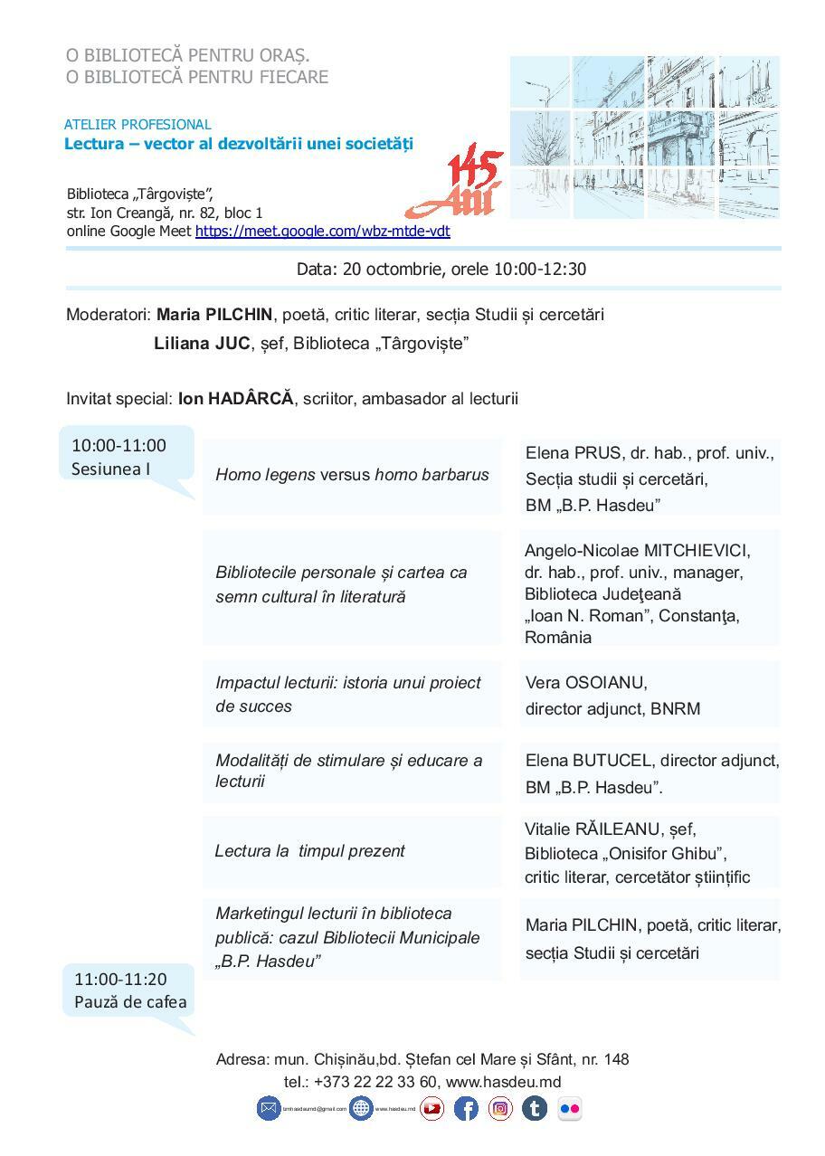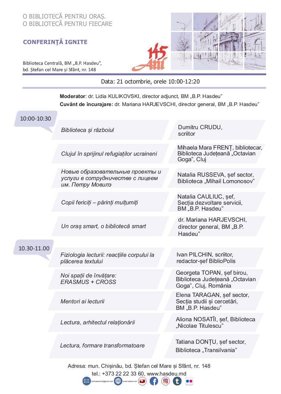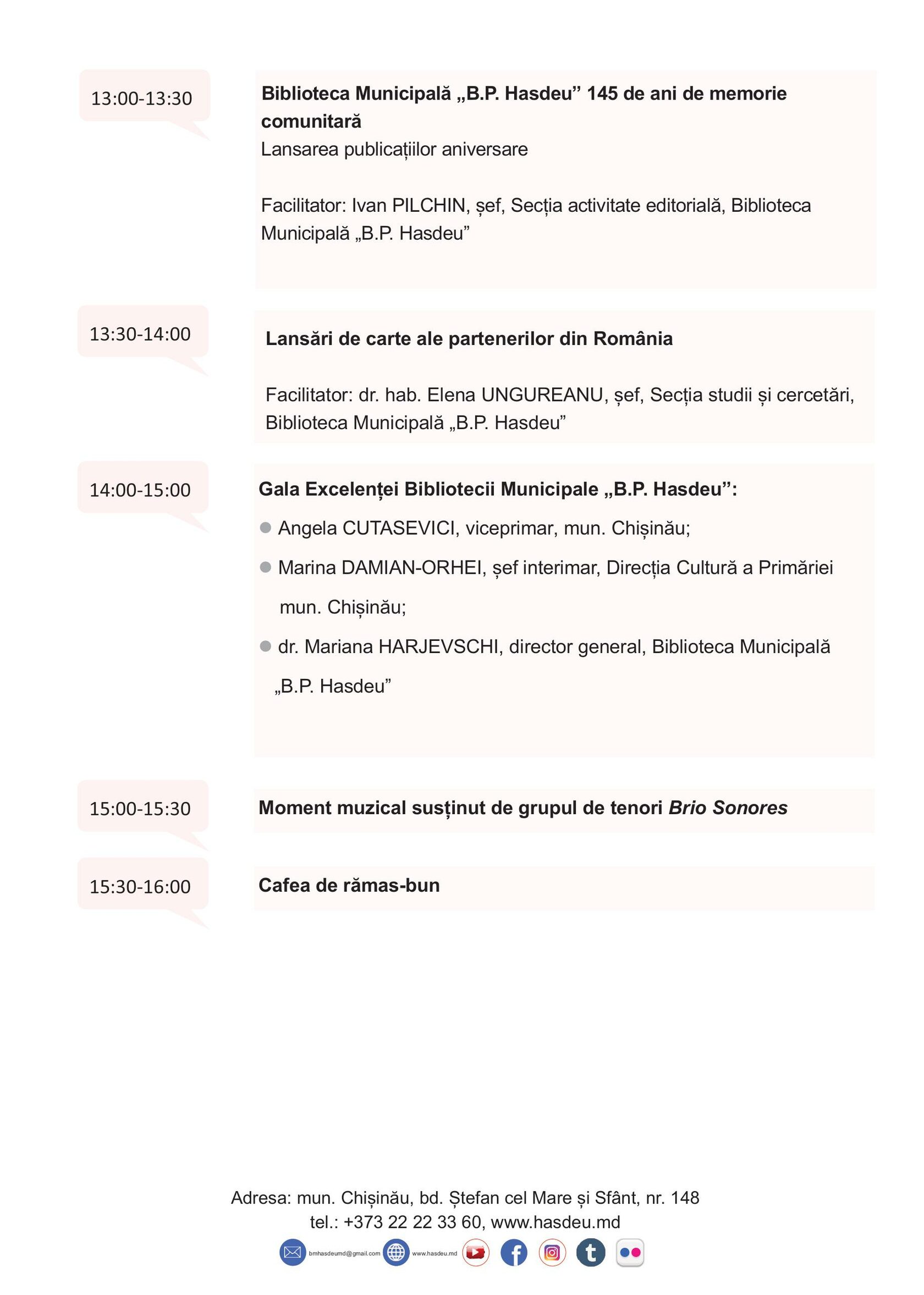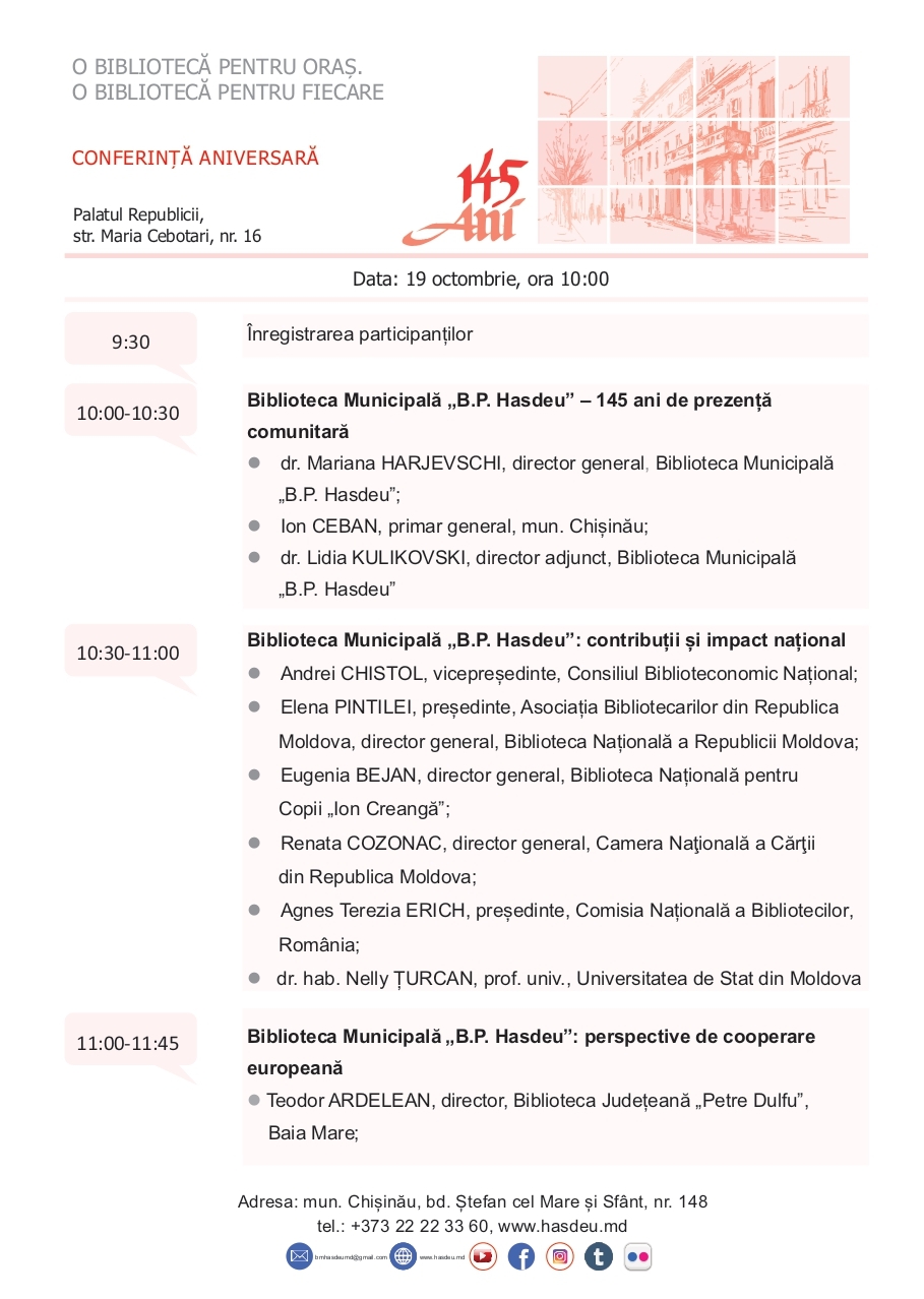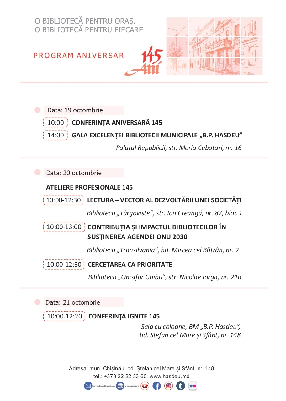 O bibliotecă pentru oraș. O bibliotecă pentru fiecare.Cu ocazia celebrării celor 145 de ani de la fondarea Bibliotecii Municipale „B.P. Hasdeu” ne propunem să aducem biblioteca mai aproape de modelele europene, atât ca utilitate, cât și ca performanță. Agenda va oferi prilejul de a reflecta activitatea bibliotecilor, implicarea lor în programe inovative și creative pentru comunitate și a îmbina armonios realizările, cercetările și noile direcții moderne de dezvoltare a bibliotecii cu serviciile conectate la necesitățile comunității.