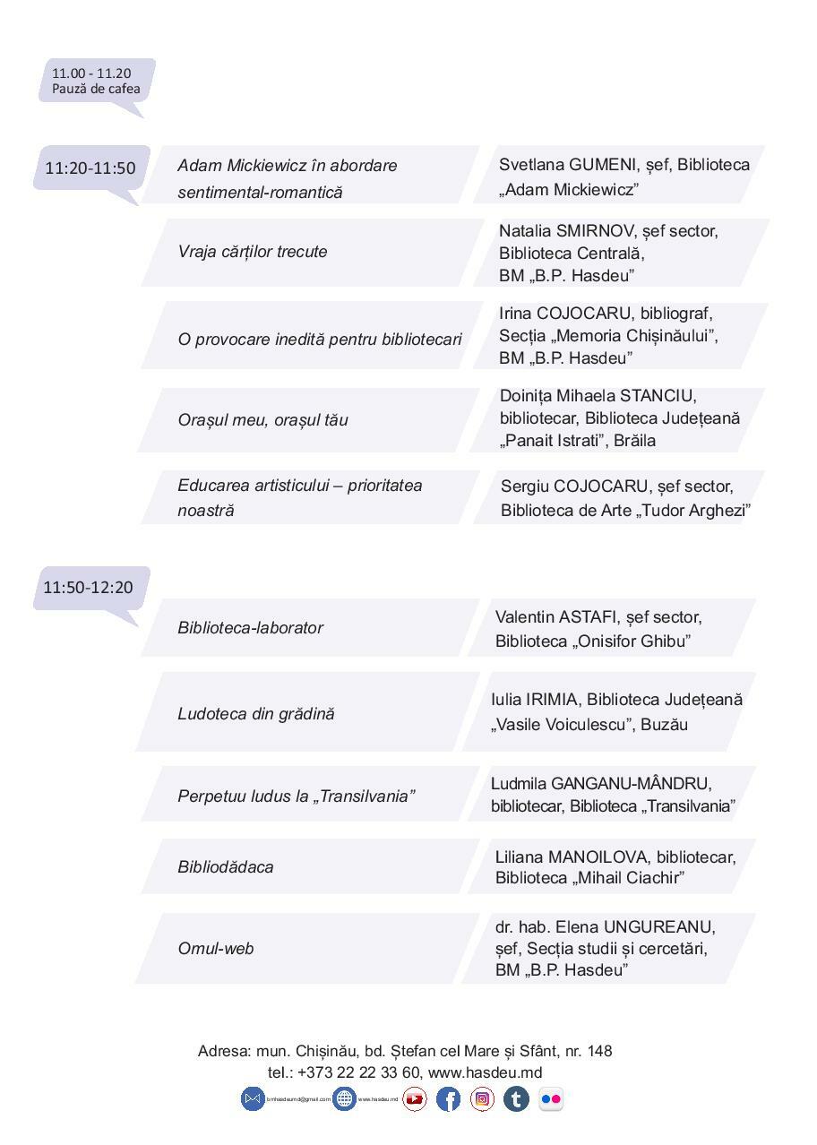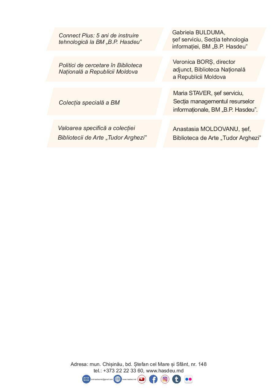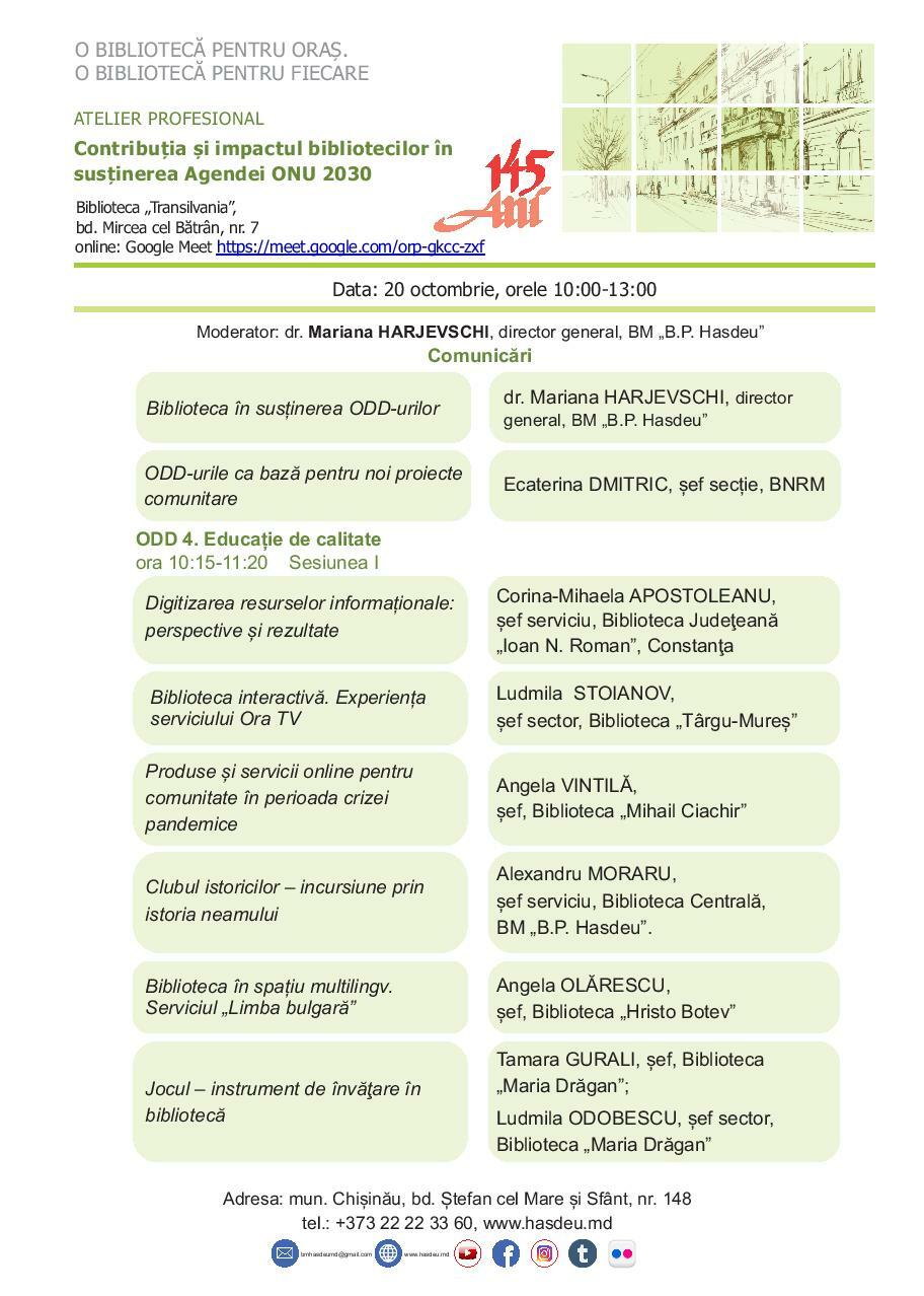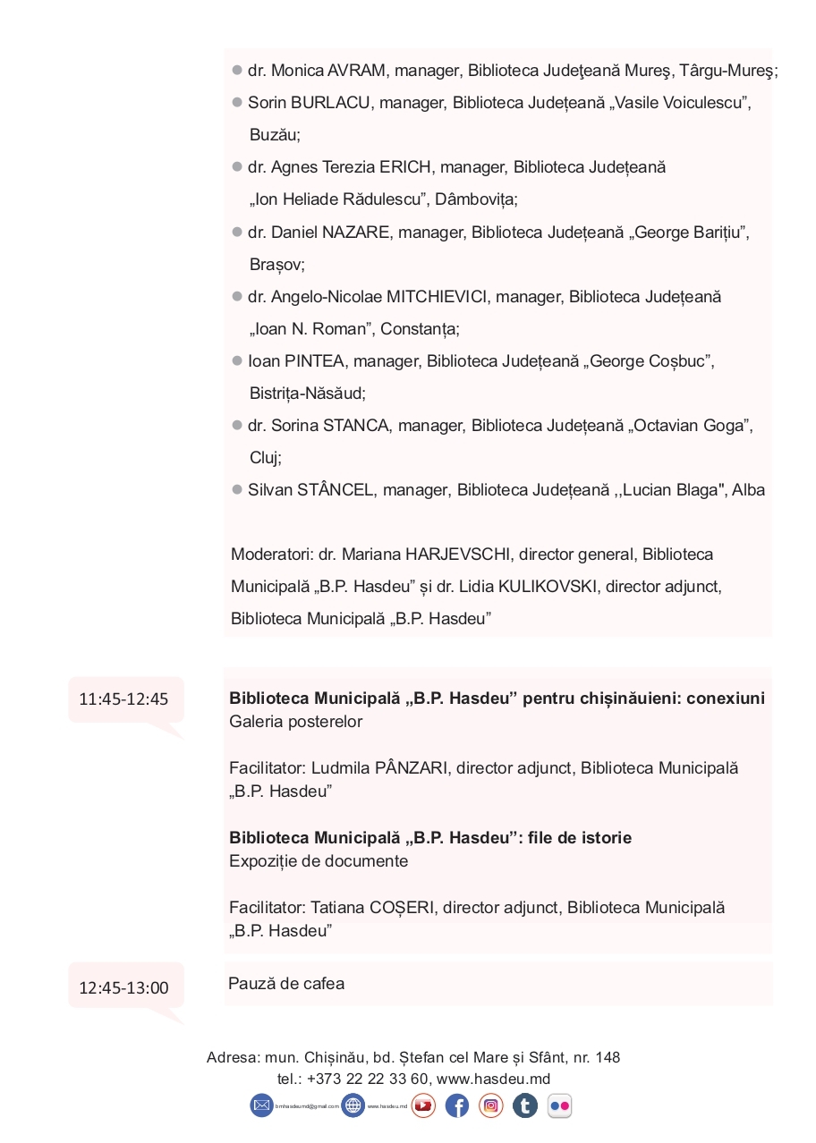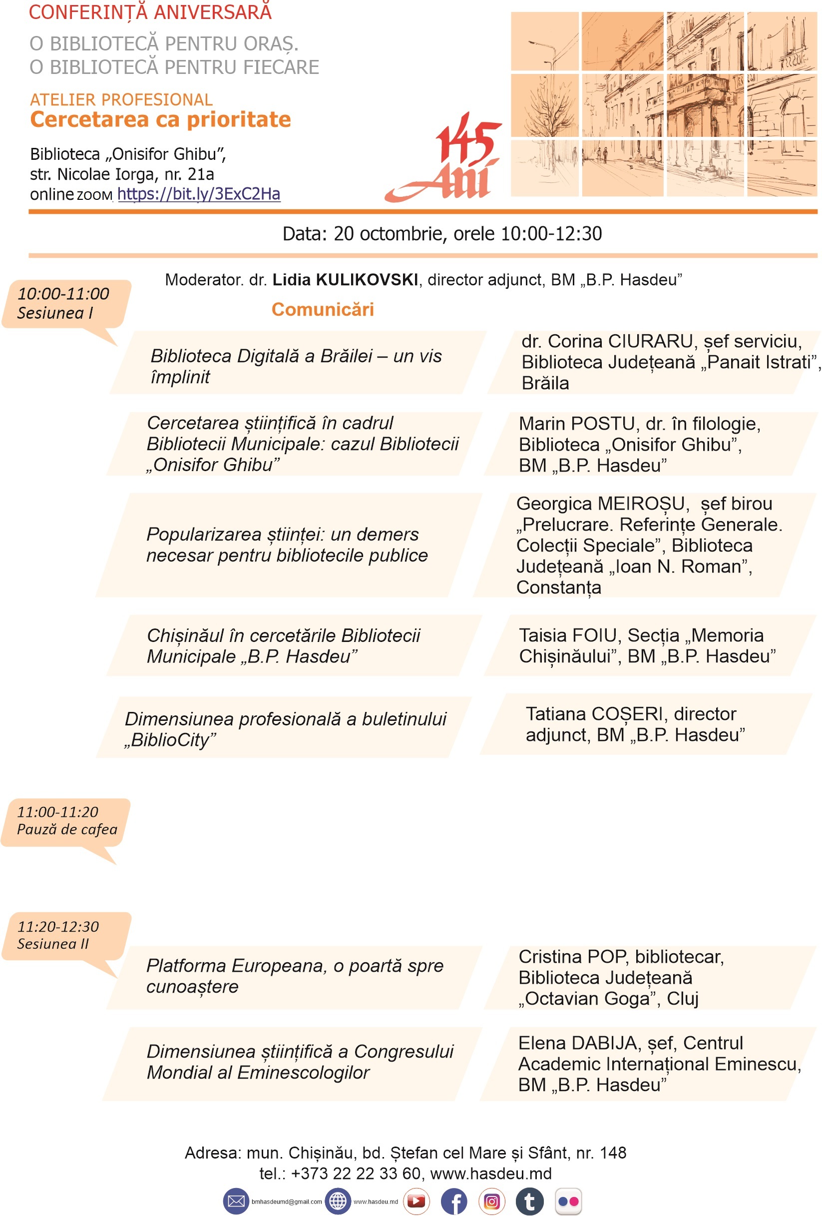 O bibliotecă pentru oraș. O bibliotecă pentru fiecare.Cu ocazia celebrării celor 145 de ani de la fondarea Bibliotecii Municipale „B.P. Hasdeu” ne propunem să aducem biblioteca mai aproape de modelele europene, atât ca utilitate, cât și ca performanță. Agenda va oferi prilejul de a reflecta activitatea bibliotecilor, implicarea lor în programe inovative și creative pentru comunitate și a îmbina armonios realizările, cercetările și noile direcții moderne de dezvoltare a bibliotecii cu serviciile conectate la necesitățile comunității.
